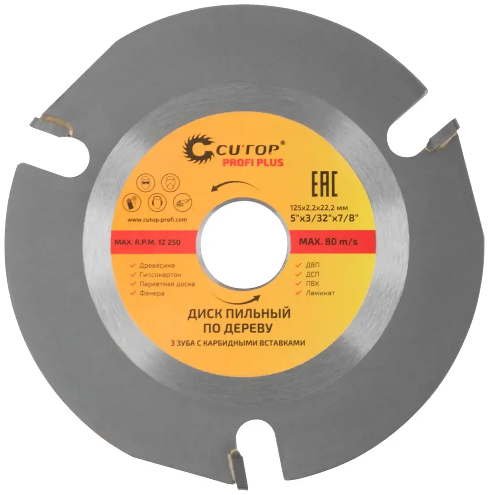 - Если нужен надежный инструмент без лишних усложнений, обратите внимание на Диск пильный по дереву для УШМ, 3 зуба с карбидными вставками Cutop Profi Plus 125x2,2x22,2мм
