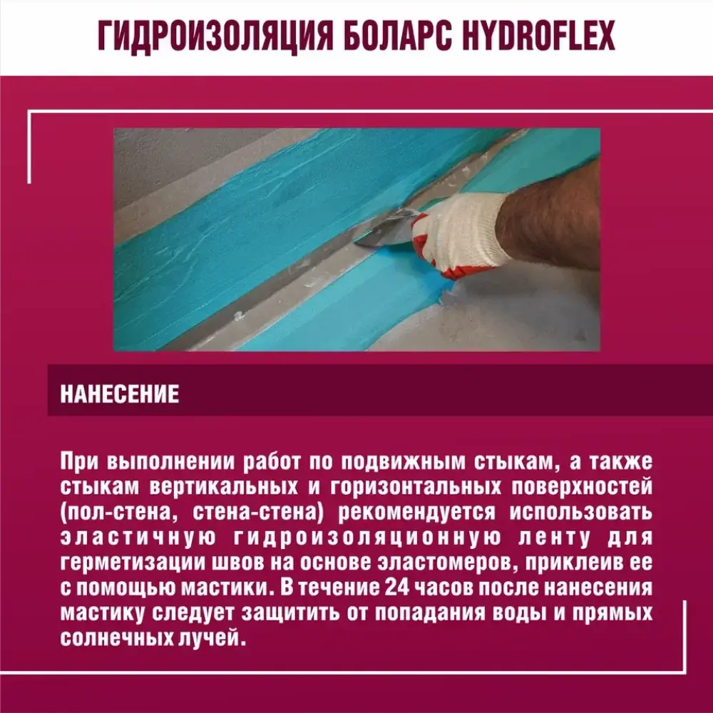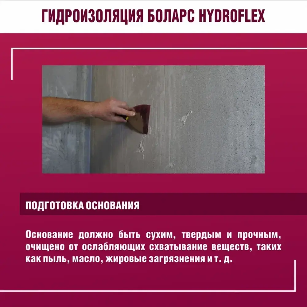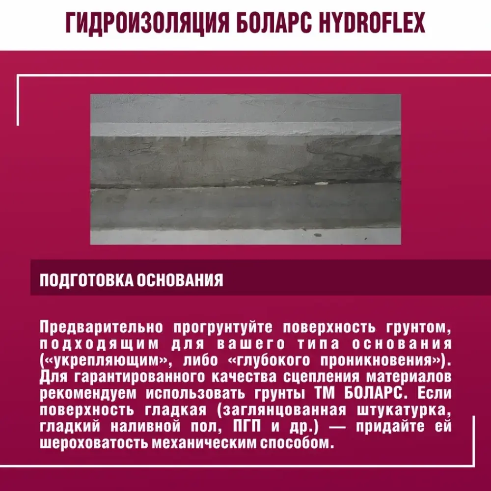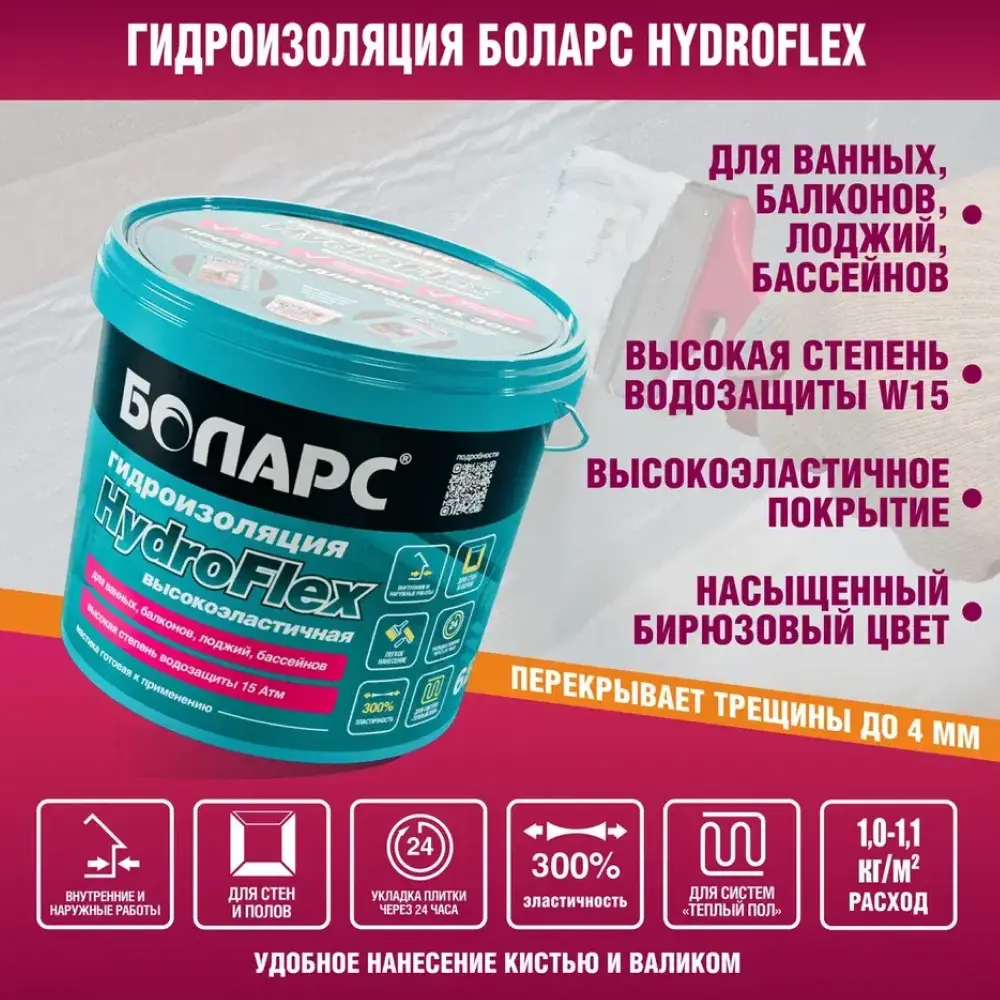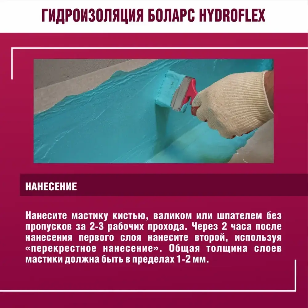 полов и рабочих поверхностей во влажных помещениях (кухни, Гидроизоляционная мастика БОЛАРС «HydroFlex» предназначена для устройства бесшовной гидроизоляции стен, ванные комнаты, душевые кабины, прачечные, балконы) перед облицовкой керамической плиткой. Для защиты оснований из бетона, кирпича, пенобетона, каменных и керамических кладок, цементно-песчаных штукатурок, в том числе для защиты чувствительных к влаге оснований: гипсовых штукатурок и полов, гипсокартонных и гипсоволокнистых листов, пазогребневых плит и блоков. Используется в системах «теплый пол».