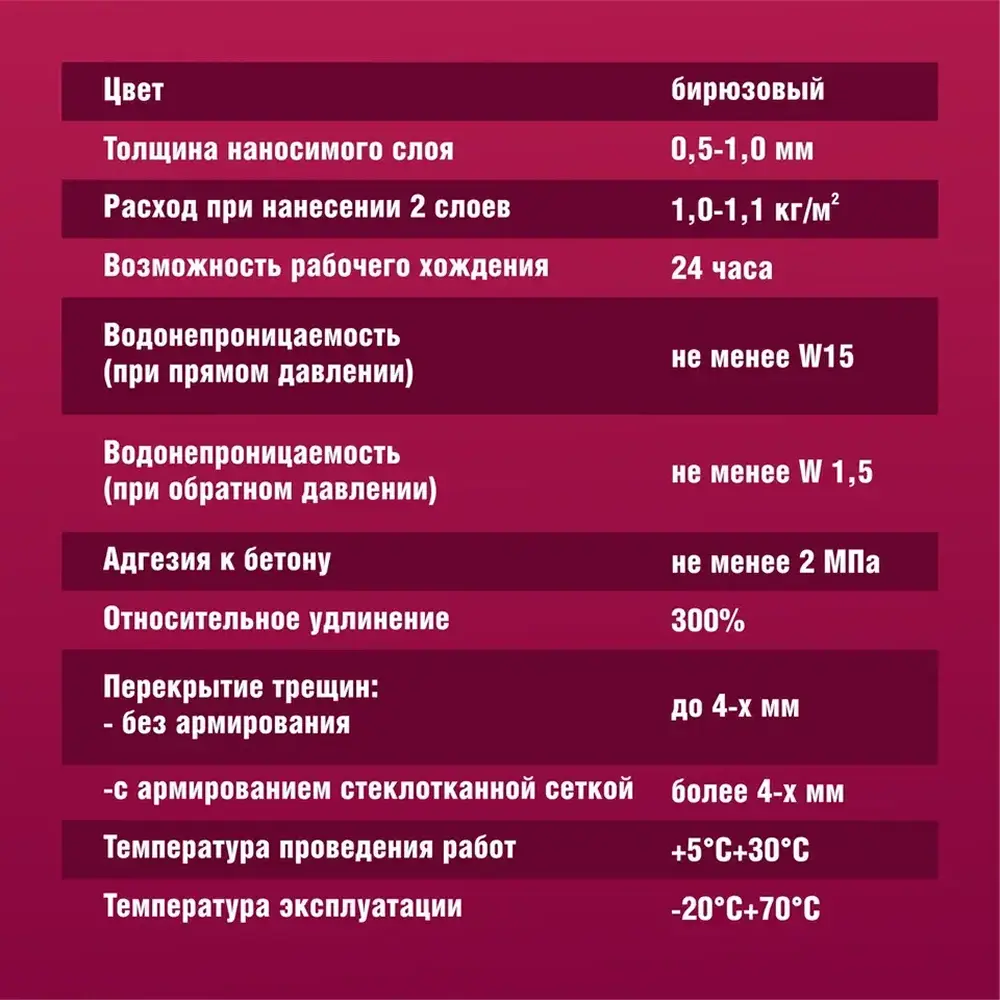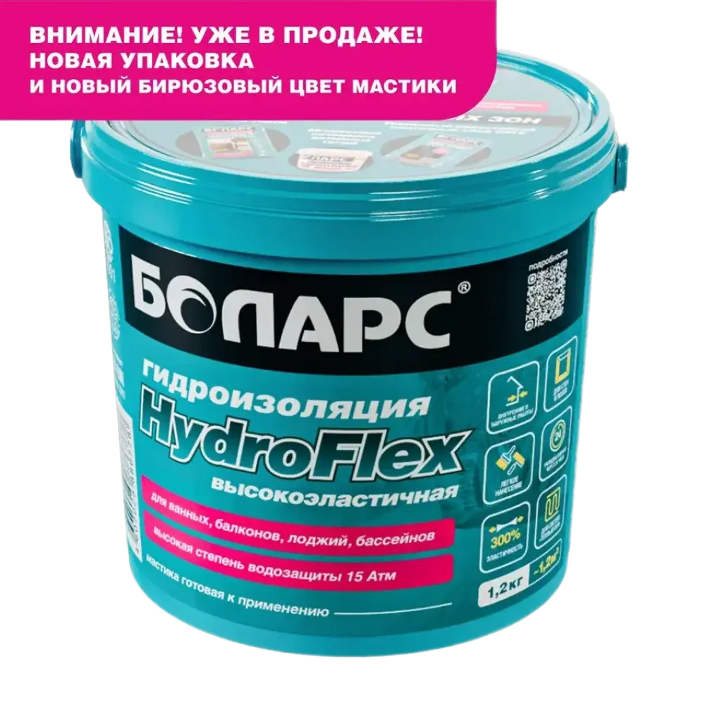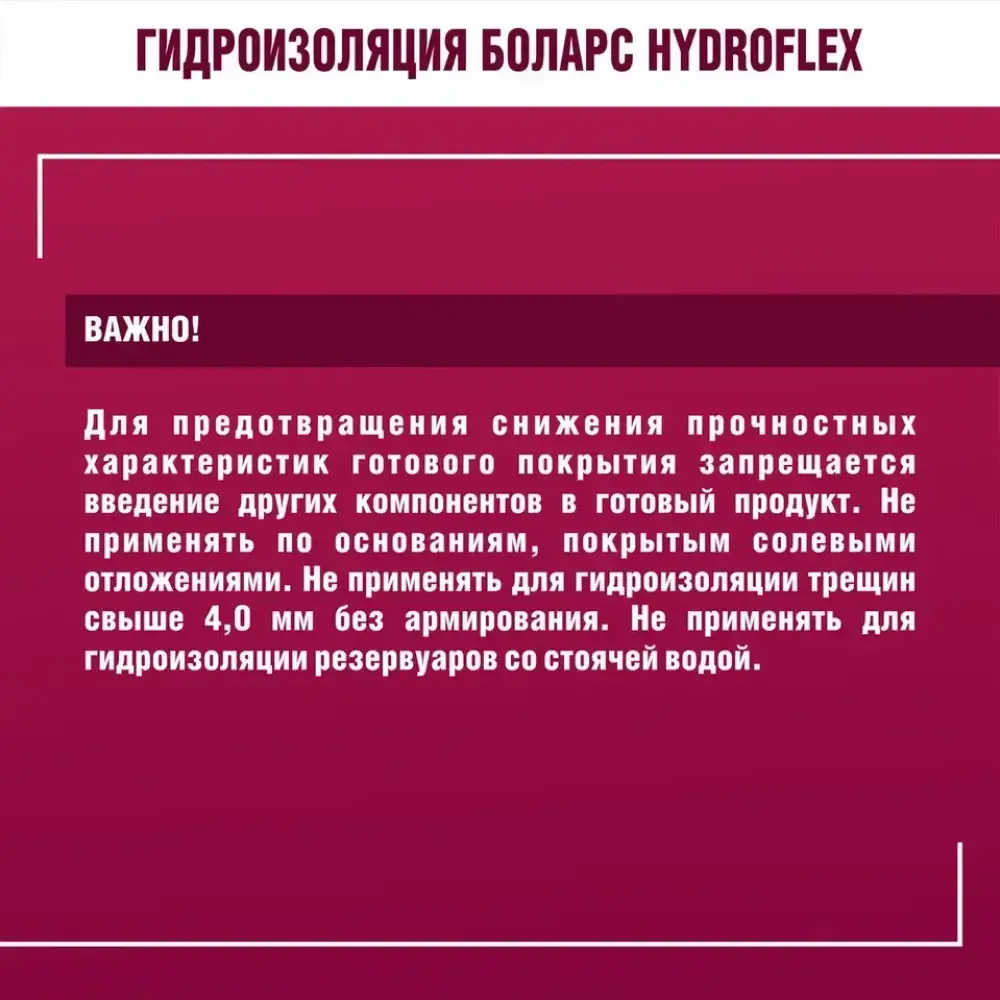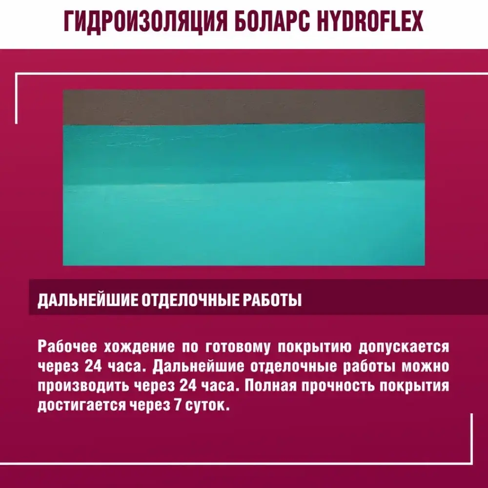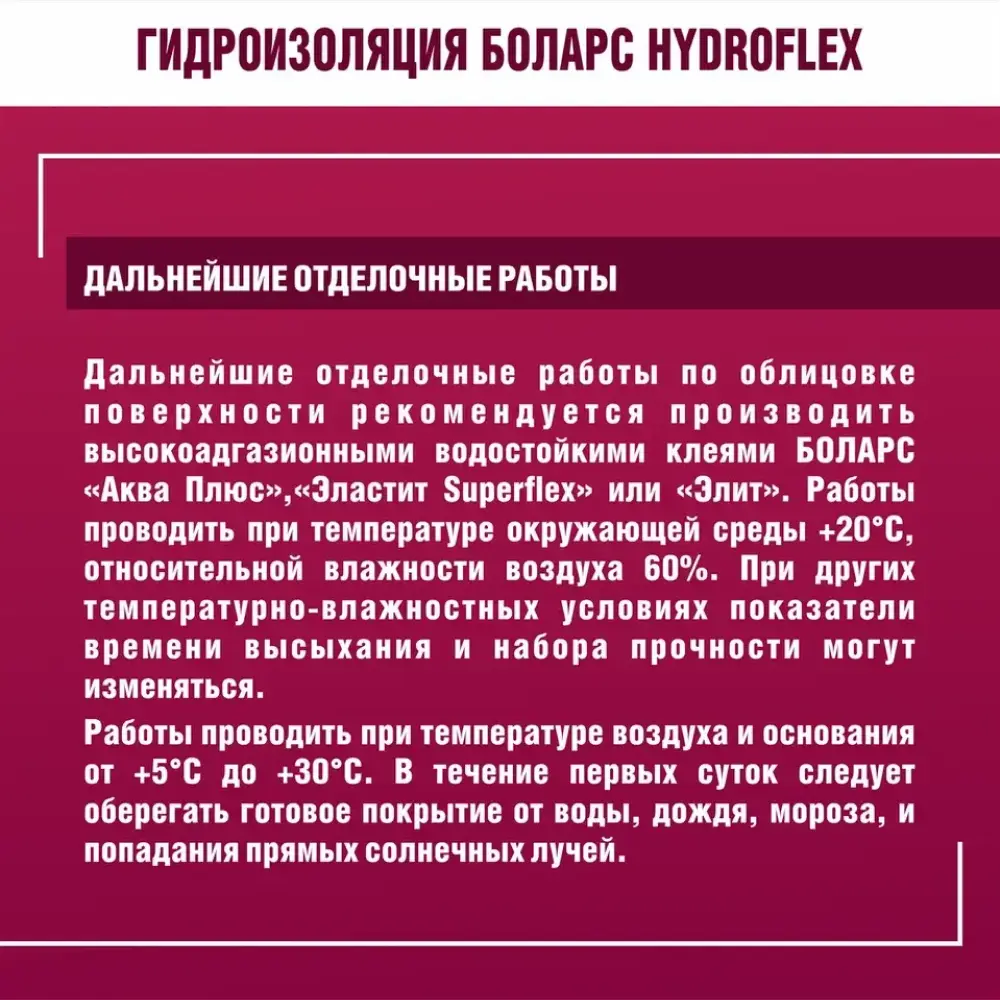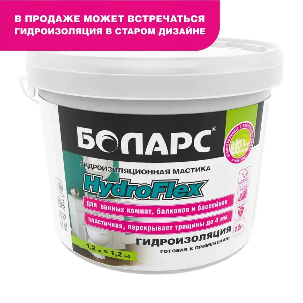 полов и рабочих поверхностей во влажных помещениях (кухни, Гидроизоляционная мастика БОЛАРС «HydroFlex» предназначена для устройства бесшовной гидроизоляции стен, ванные комнаты, душевые кабины, прачечные, балконы) перед облицовкой керамической плиткой. Для защиты оснований из бетона, кирпича, пенобетона, каменных и керамических кладок, цементно-песчаных штукатурок, в том числе для защиты чувствительных к влаге оснований: гипсовых штукатурок и полов, гипсокартонных и гипсоволокнистых листов, пазогребневых плит и блоков. Используется в системах «теплый пол».