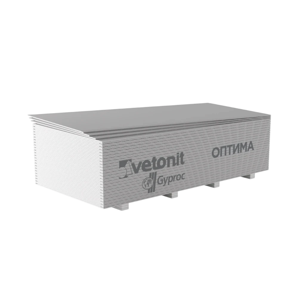 Гипсокартонный лист Vetonit Gyproc Оптима размером 2500х1200 мм и толщиной 12,5 мм подходит для большинства внутренних работ по стенам, перегородкам и потолкам. Материал подходит для внутренней отделки и формирует ровное основание под дальнейшую финишную обработку.