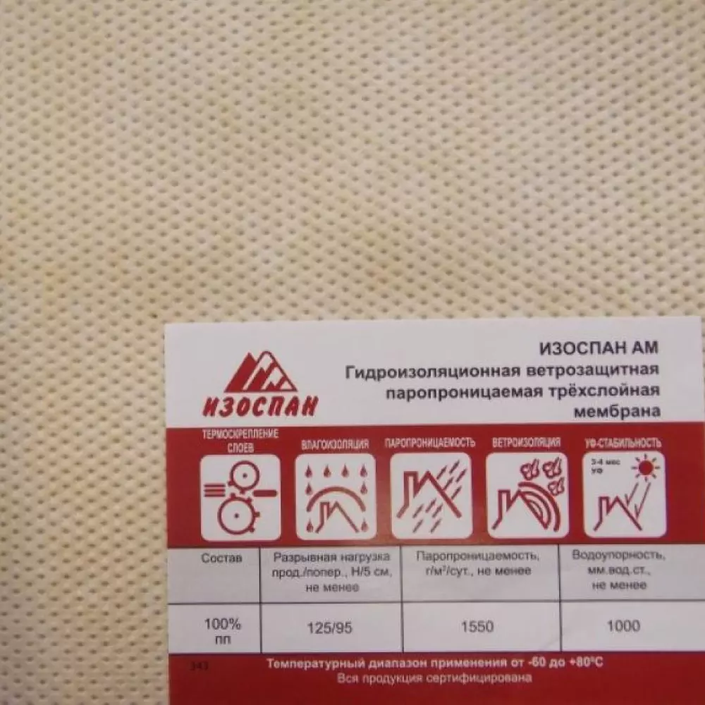 Изоспан АМ – современная гидро-ветрозащитная паропроницаемая мембрана, предназначенная для защиты минераловатного утеплителя и строительных конструкций от влаги, конденсата, ветровых порывов и атмосферных осадков. Представляет собой микропористую пленку из полипропилена, с обеих сторон продублированную нетканым полотном из того же полимера. Водоупорный, паропроницаемый, безопасный. Надежно защищает от осадков и конденсата, удобен в монтаже, так как на материале нанесена разметка. Существенно продлевает ресурс утепляющего слоя и всего здания, сохраняет его теплоэффективность вне зависимости от внешних условий.