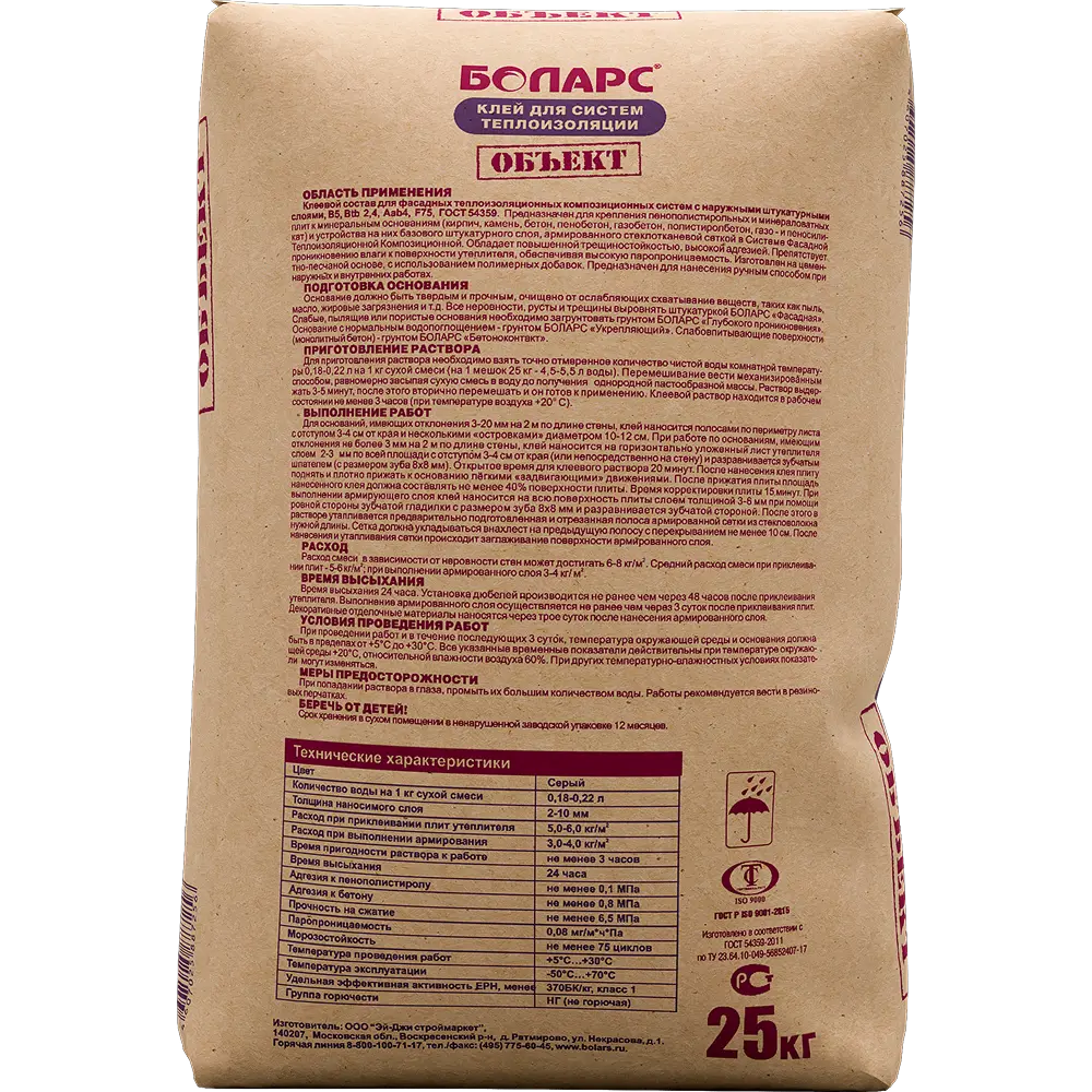 Клеевой и базовый состав на цементном вяжущем для систем фасадных теплоизоляционных композиционных с наружными штукатурными слоями (СФТК) Подходит для крепления пенополистирольных и минераловатных плит к минеральным основаниям (кирпичные, каменные, бетонные и газобетонные поверхности) и устройства на них базового штукатурного слоя. Препятствует проникновению влаги к поверхности утеплителя, обеспечивая при этом необходимую паропроницаемость. Предназначен для нанесения ручным способом. Изготовлен на цементно-песчаной основе, с применением эффективных полимерных и модификаторов. Для работ при температуре до -10 ºС выпускается зимняя морозостойкая версия (маркируется стикером «снежинка»). При монтаже СФТК стоит руководствоваться Регламентом производства работ для проектирования и строительства Системы фасадной теплоизоляционной композиционной БОЛАРС.