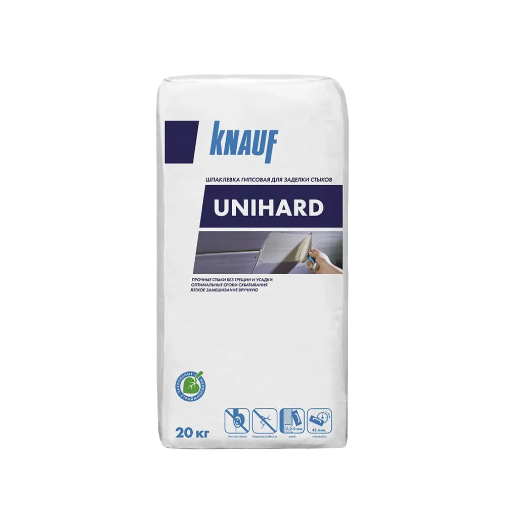 Шпаклевка гипсовая для заделки швов и стыков Knauf Унихард позволяет заделать дефекты поверхностей, стыки между гипсокартонными и гипсоволокнистыми листами, зашпаклевать их. Материал представлен в виде сухой смеси. Гипсовая шпаклевка не трескается, стойко переносит механические повреждения.