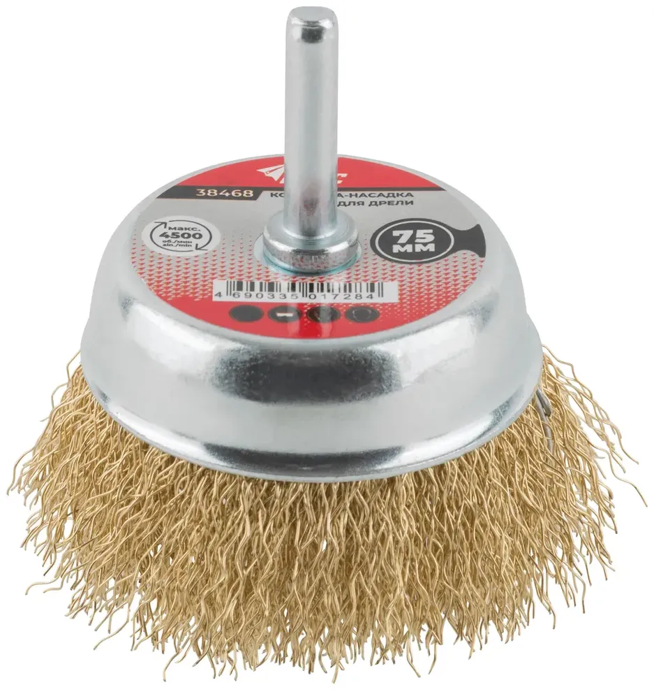 - Если нужен надежный инструмент без лишних усложнений, обратите внимание на Корщетка чашечная, со шпилькой, стальная латунированная волнистая проволока 75 мм