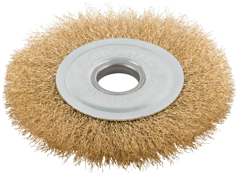 - Если нужен надежный инструмент без лишних усложнений, обратите внимание на Корщетка дисковая прямая, посадочный диаметр 22,2 мм, стальная латунированная волнистая проволока 12