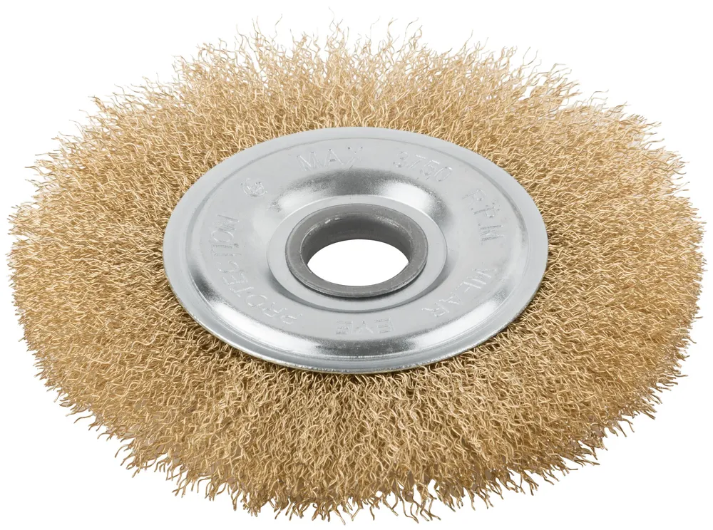 - Если нужен надежный инструмент без лишних усложнений, обратите внимание на Корщетка дисковая прямая, посадочный диаметр 22,2 мм, стальная латунированная волнистая проволока 15