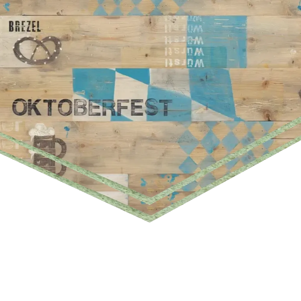 Декор Октоберфест способен преобразить любой интерьер, словно заражая его духом свободы и разгульного веселья. Смелое сочетание нарочито грубой древесины, пивных кружек с бьющей через край пеной, кренделей и бело-голубых ромбов – всё это будто затягивает нас в круговорот танцев, песен и гастрономических вольностей. Строительная плита Quick Deck Plus Октоберфест - это влагостойкая шпунтованная ДСП, покрытая прочной декоративной плёнкой.