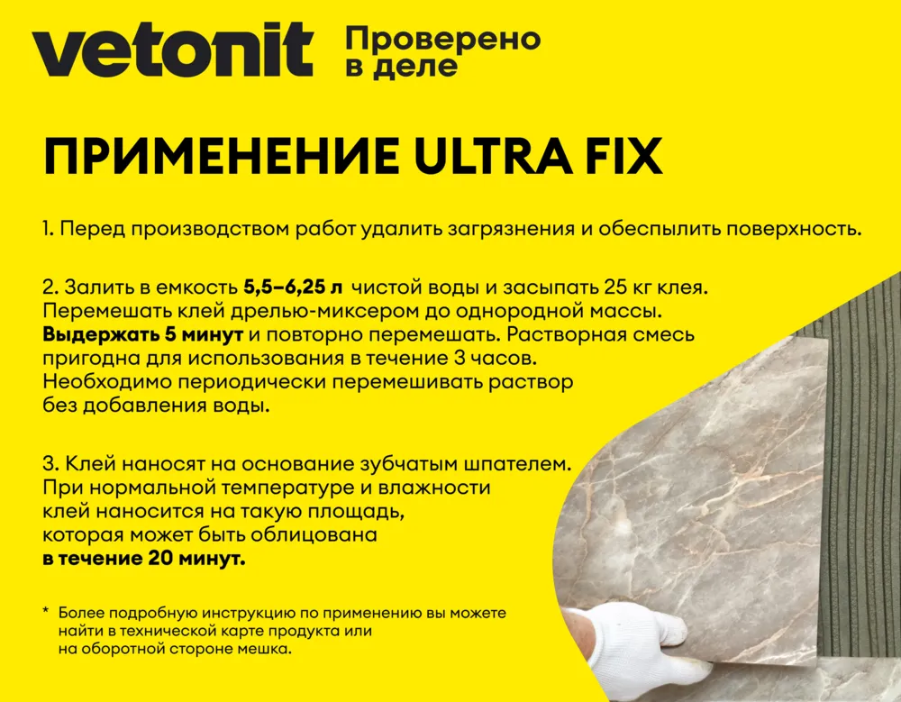 Для достижения наилучшего результата важно соблюдать технологию работ. Основание должно быть прочным, ровным, сухим, очищенным от пыли и грязи. Сильновпитывающие основания рекомендуется обработать грунтовкой глубокого проникновения, при этом категорически запрещено использование грунтовок типа «Бетонконтакт». Температура воздуха, основания и материалов во время работ должна быть в диапазоне от +5°C до +30°C. Перед укладкой плитку не вымачивают, а лишь очищают от пыли. После укладки плитку нельзя подвергать воздействию воды в течение 24 часов. Ходить по облицованной поверхности можно через 24 часа, а приступать к затирке швов — не ранее этого срока. При работе с системами «теплый пол» нагрев необходимо отключить за двое суток до начала работ и включить не ранее чем через 7 суток после укладки плитки. Продукт обладает морозостойкостью не менее 150 циклов, что позволяет использовать его на открытых террасах, балконах и фасадах. Клей поставляется в бумажных трехслойных мешках по 25 кг, срок его хранения в сухом помещении в оригинальной упаковке составляет 12 месяцев.
