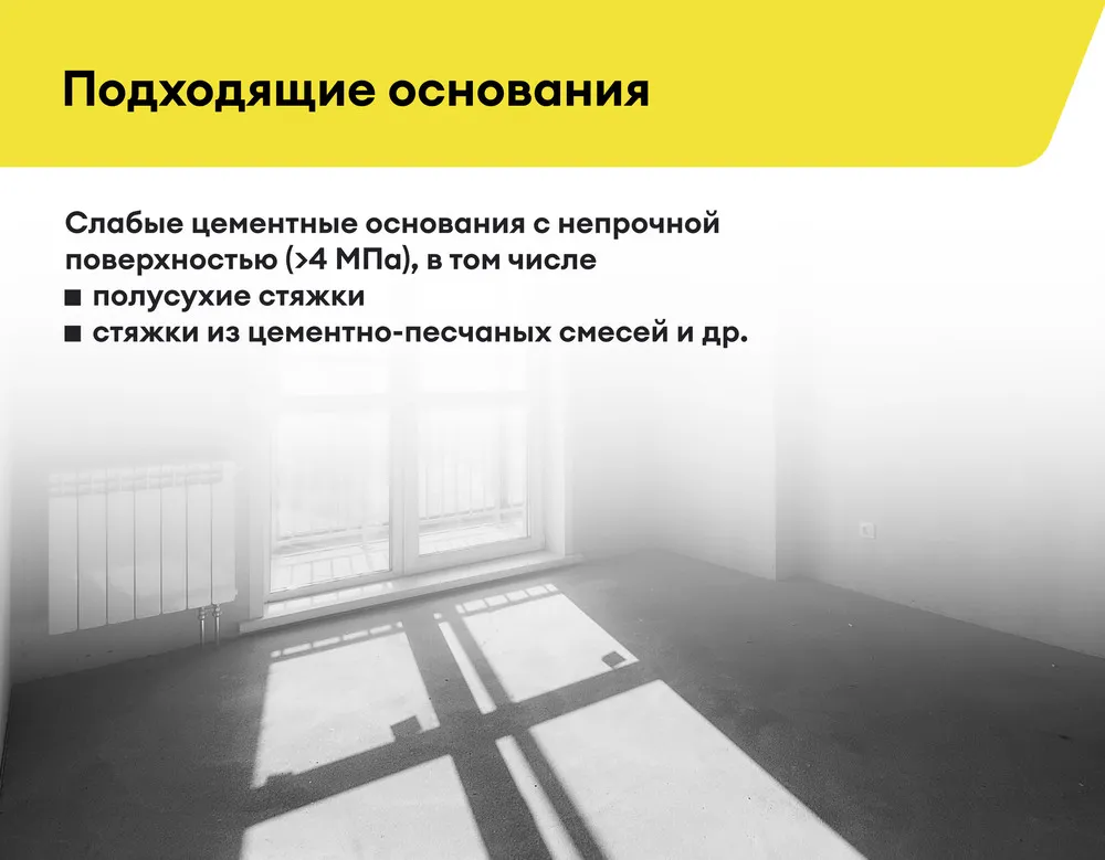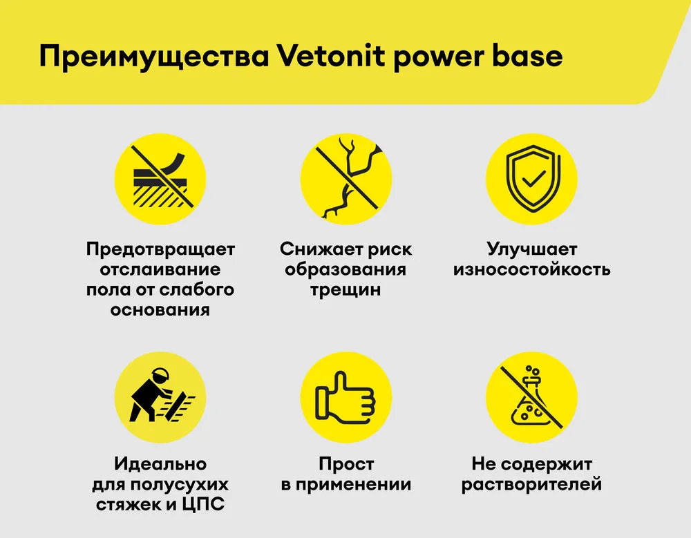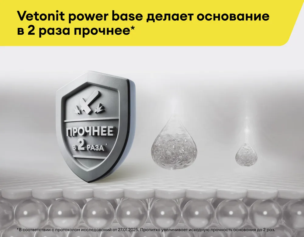 Пропитка Vetonit Power Base представляет собой готовый к применению состав на основе силикатов, предназначенный для укрепления и подготовки цементных оснований перед последующими отделочными работами. Она глубоко проникает в структуру материала, связывая частицы и существенно повышая прочность поверхности, что делает основание до двух раз прочнее. Продукт эффективно обеспыливает основание, выравнивает его впитывающую способность и улучшает адгезию для наливных полов, ровнителей, клеев и напольных покрытий. Эта пропитка идеально подходит для обработки традиционных и полусухих цементно-песчаных стяжек, предотвращая отслаивание финишных слоев и снижая риск образования трещин. Её можно применять для внутренних и наружных работ в жилых и общественных зданиях.