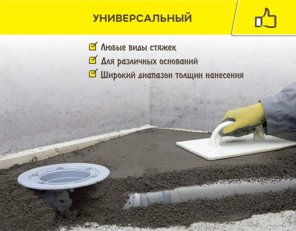 Быстротвердеющий ровнитель на цементной основе для базового выравнивания оснований, создания стяжек, уклонов и реализации специальных решений внутри помещений. Обладает высокой скоростью набора прочности: ходить по полу можно уже через 3 часа, а укладывать напольное покрытие — через 15 часов при температуре +20°C. Продукт водостойкий, подходит для сухих и влажных помещений, а также для использования с системами «теплый пол». Применяется для выравнивания бетонных, цементно-песчаных оснований, старого бетона, гипсовых оснований и стяжек с трещинами. Идеален для срочного ремонта, создания подиумов, формирования чаш душевых кабин, ремонта ступеней, скрытия коммуникаций и заделки труб в полу. Позволяет заливать слой толщиной от 10 до 250 мм за один проход. Основное связующее — быстротвердеющий цемент серого цвета. Расход смеси составляет примерно 1.8 кг на квадратный метр при толщине слоя 1 мм. На мешок весом 25 кг требуется 2.0 литра чистой воды (около 8% от веса смеси). Жизнеспособность готового раствора составляет 30 минут. Прочность на сжатие через 28 суток достигает не менее 20 МПа. Работы проводятся при температуре от +10°C до +25°C. Включение системы «теплый пол» возможно через 28 суток после укладки ровнителя. Срок хранения в сухом помещении в оригинальной упаковке составляет 9 месяцев.