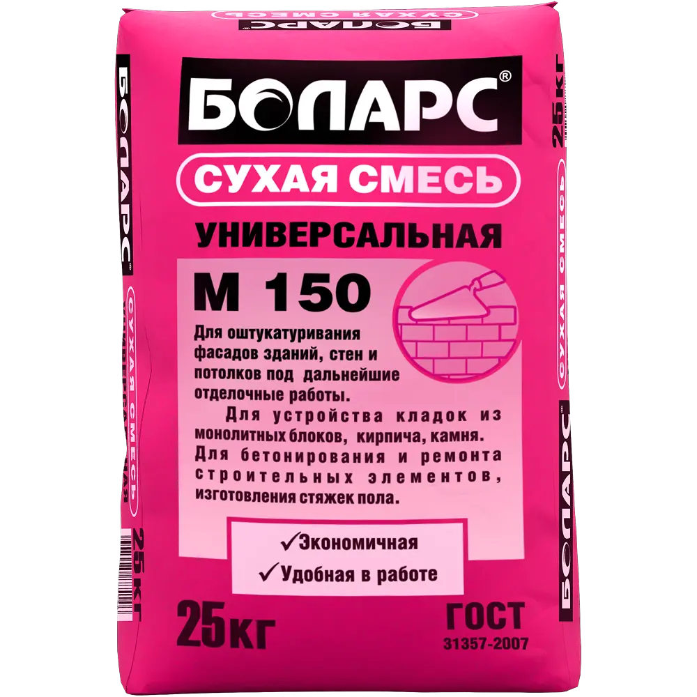 стен и потолков под дальнейшие отделочные работы. Предназначена для первичного выравнивания горизонтальных оснований и изготовления высокопрочных стяжек пола в помещениях, Универсальная смесь М 150 на основе портландцемента и фракционированного кварцевого песка для оштукатуривания фасадов зданий, подверженных повышенным эксплуатационным нагрузкам. Применяется для устройства фундаментов и отливок в качестве мелкозернистого бетона, а также устранения дефектов бетонных конструкций и заделки швов между бетонными перекрытиями. Можно наносить ручным способом на бетонные, кирпичные, каменные поверхности, песчано-гравийные подушки под фундамент. Смесь выполнена на основе портландцемента, фракционированного кварцевого песка.