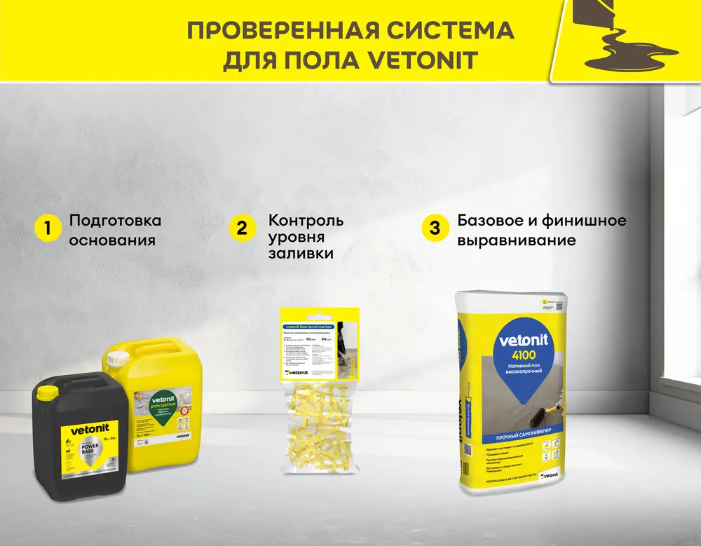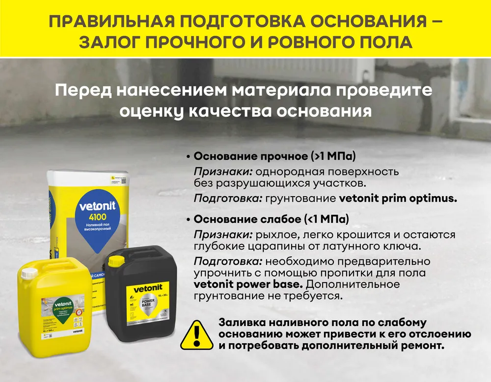 Основание должно быть сухим, твердым, прочным и очищенным от пыли, грязи, масел, жира и отслаивающихся элементов. Перед заливкой основание необходимо обработать грунтовкой. Рекомендуется использовать грунтовки Vetonit Prim Optimus или Vetonit MD 16. Запрещено применять грунтовки, содержащие кварцевый песок или мраморную крошку (типа «Бетонконтакт»). Для слабых оснований с прочностью на отрыв менее 1 МПа требуется предварительное упрочнение специальной пропиткой (например, Vetonit Power Base).